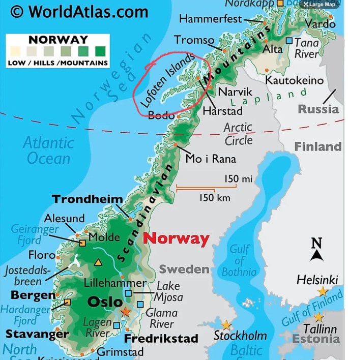 But this post is really about the majesty of the archipelago of Lofoten…. Indicated on the map below for those of you who may need a little geographic orientation.
