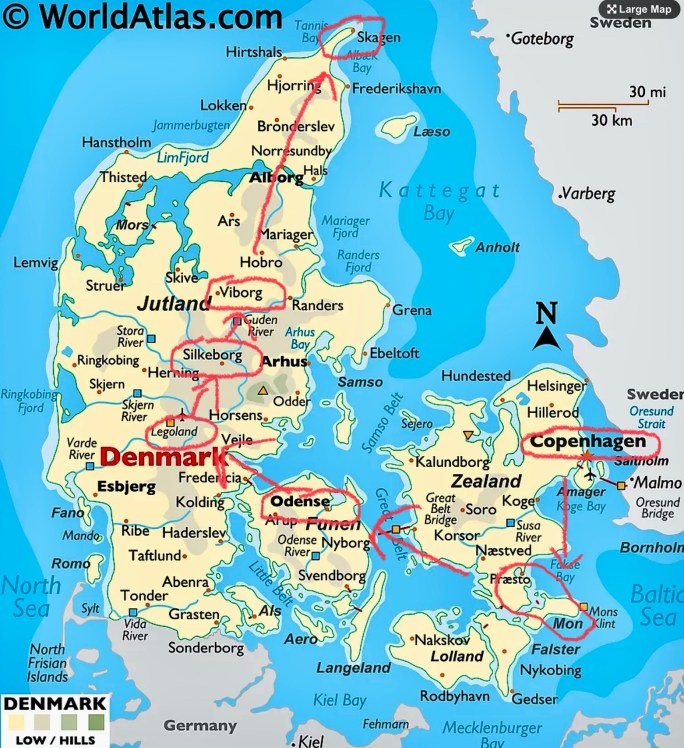From Copenhagen we wandered a bit…. For those of you who may not be familiar with Denmark’s geography, I have marked up this map to show our path…..