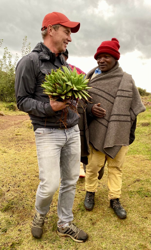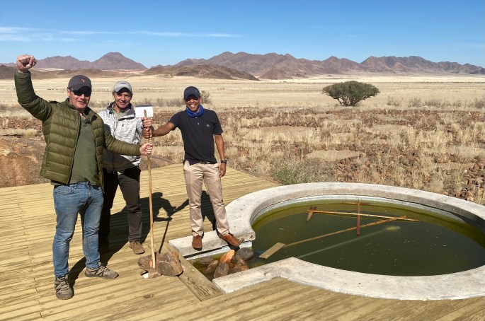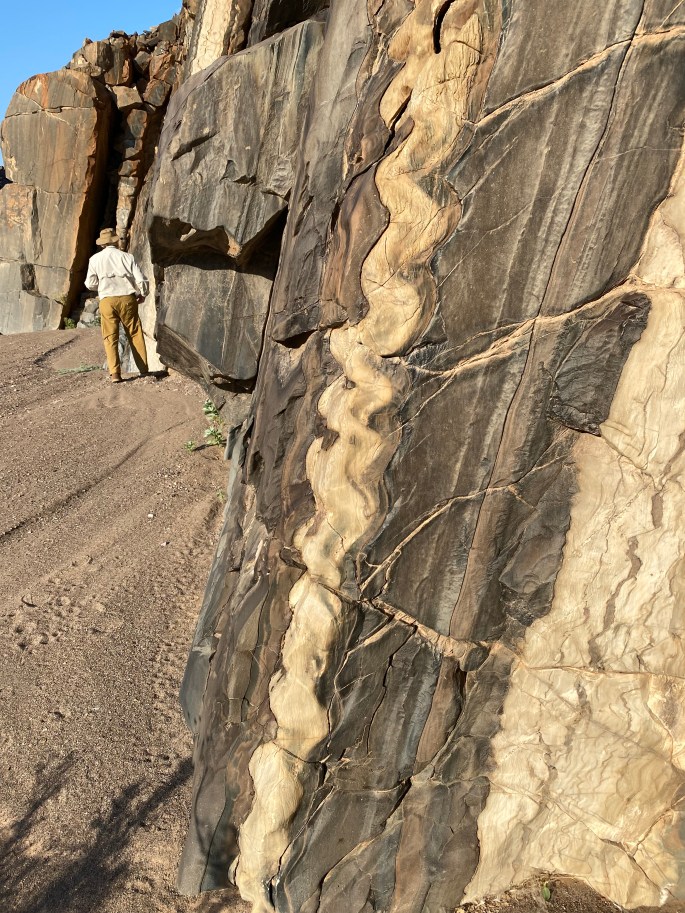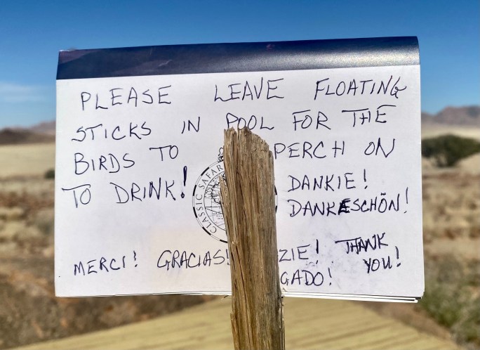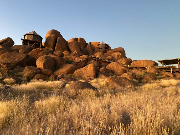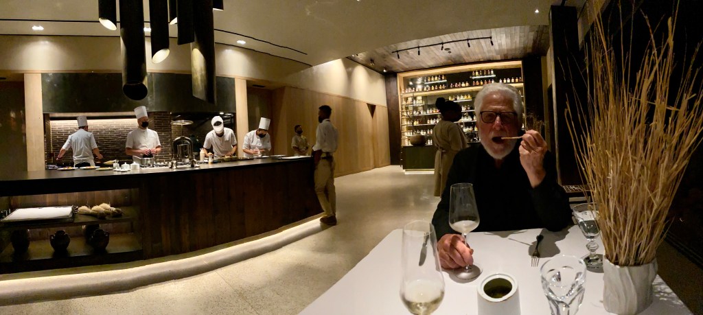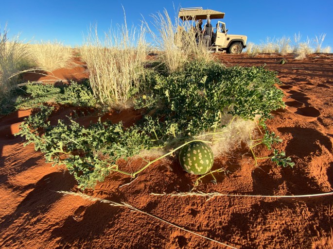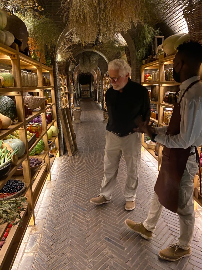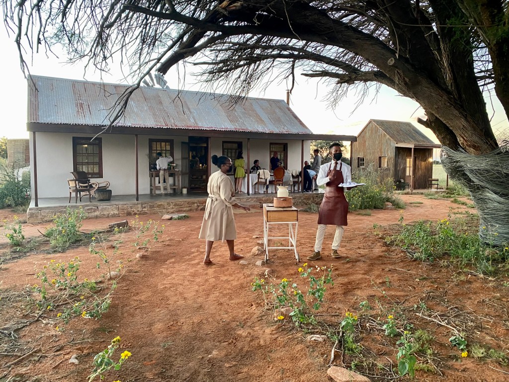 There is a fine restaurant associated with this reserve…… at a great distance from pretty much anywhere. The chef is one of only two South African chefs who have received a Michelin star (which is a pretty big deal in the culinary world). People fly to the Kalahari from Cape Town or Johannesburg just for this ingeniously-prepared meal. The restaurant is dedicated to the chef’s childhood experience there, utilizing native ingredients… including wine and locally-made cheeses – as much as possible. It’s called Klein Jan, and… well, it’s just an incredible experience, starting with its entrance at what appears to be a farmhouse out in the bush…..